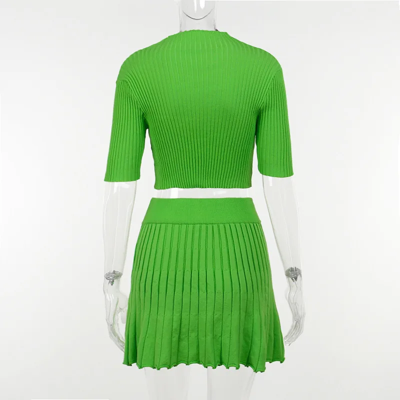 This classic two piece set is perfect for any occasion. Featuring a knitted short sleeve top and pleated skirt, this set is crafted with quality materials for long-lasting wear. The pleated skirt has a modern silhouette and the comfortable knit top ensures a polished look. Invest in timeless fashion with this classic set.